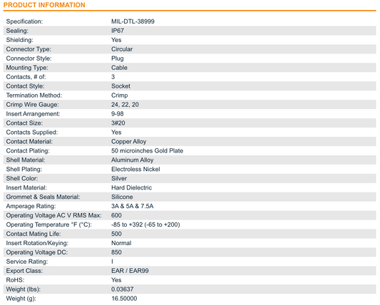 NEW Amphenol TVS06RF-9-98S - 3 Position Circular Mil Spec Connector TVS06RF998S